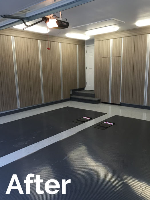 The client requested the design of their ideal garage, featuring efficient wall-mounted storage solutions. We installed custom cabinetry with integrated shelving, allowing for organized storage without the need for external containers. Additionally, we applied an epoxy floor coating to enhance the surface, smoothing out imperfections and providing a clean, durable finish.